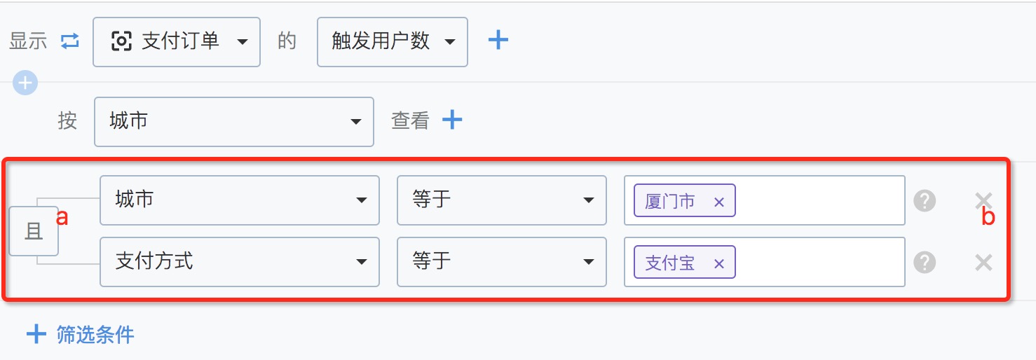 当添加了多条筛选条件时,用户可以点击下图中[a],切换筛选条件之间的关系: