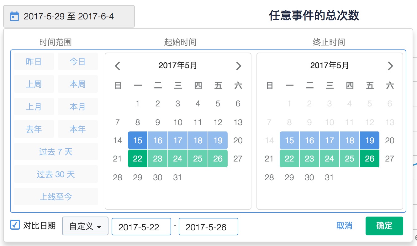 选择查询的时间范围。点击『对比时间』可以选择对比时间段,绿色的是对比时间段,此时在图形和表格中会展示两个时间段的对比数据。