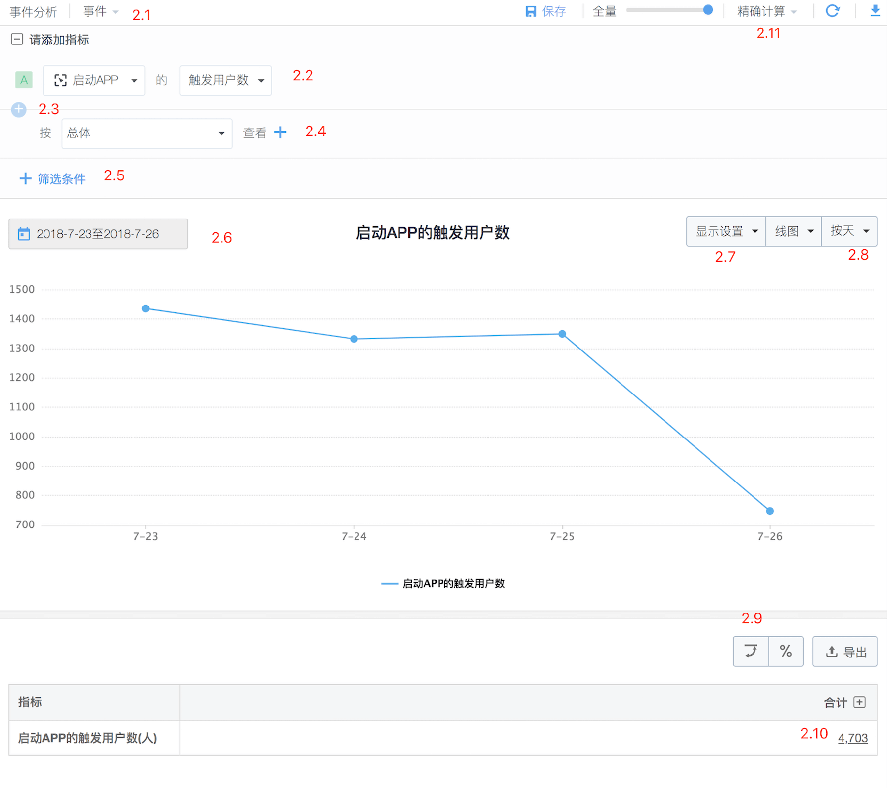 对事件的『触发用户数』进行分析,还可以下载行为相关的用户详情,见下图『j』。